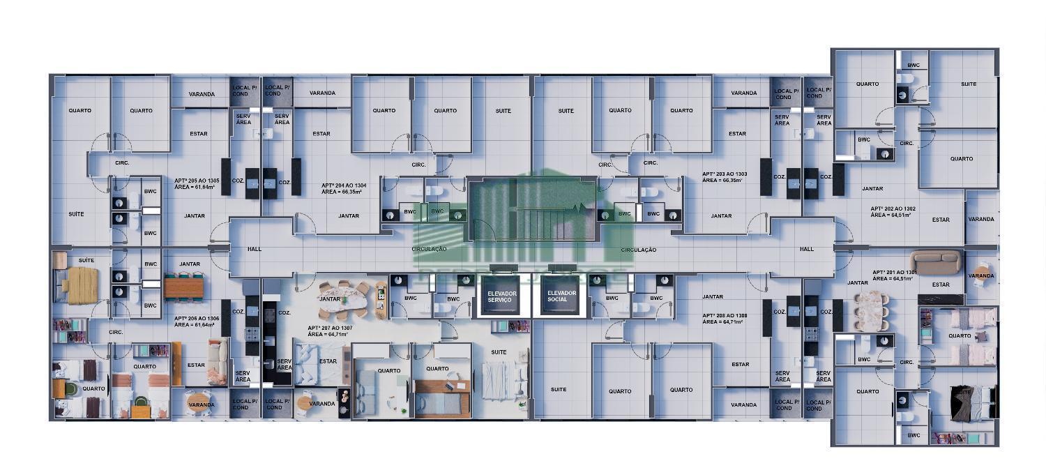 Apartamento com tipologias de 61,76m² a 80,93m² - 03 quartos, varanda, sala para 02 ambientes, circulação, banheiro social, cozinha, área de serviço e vaga de garagem.